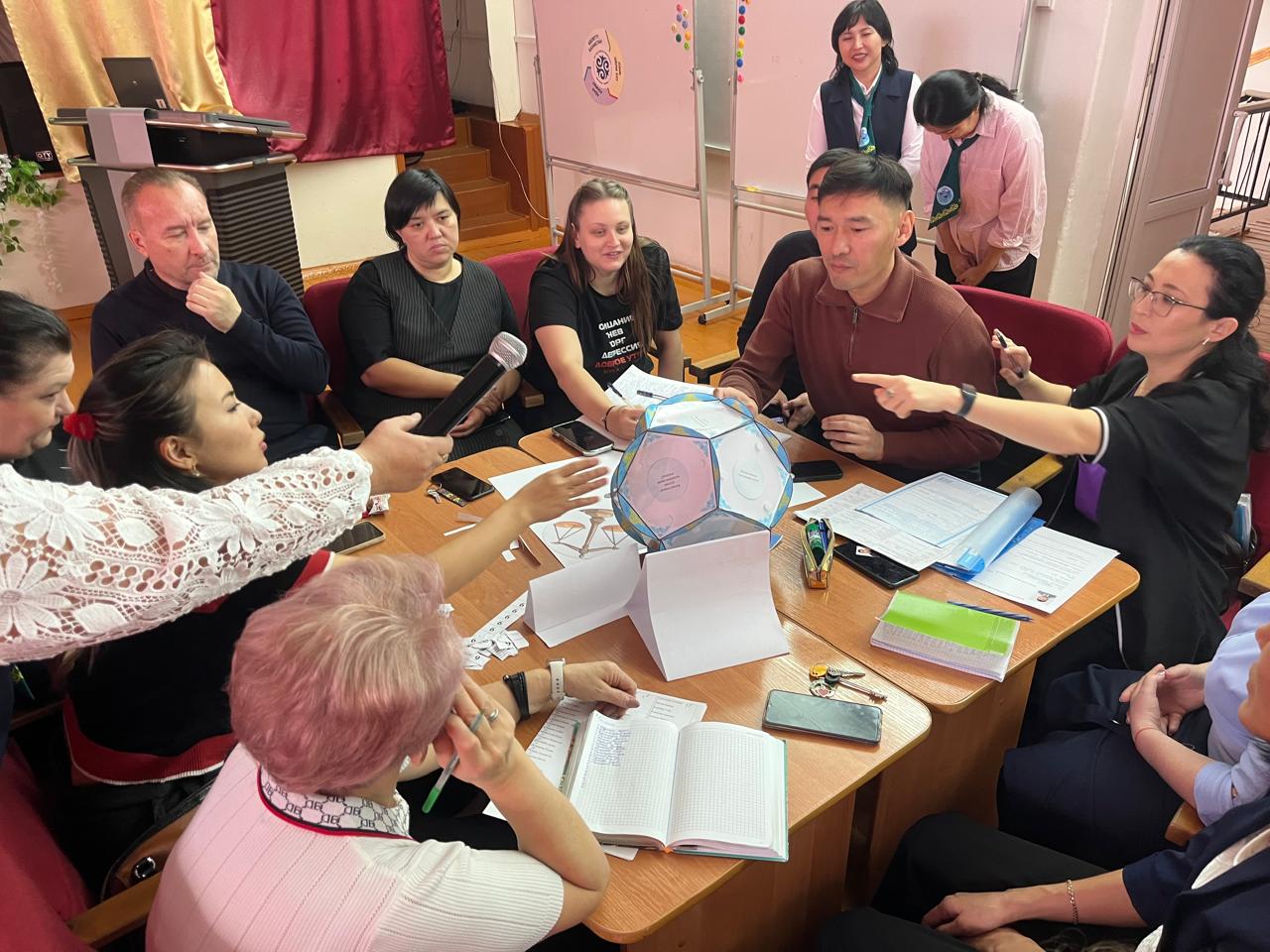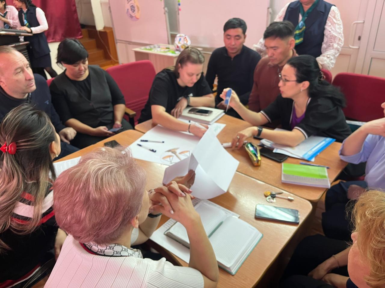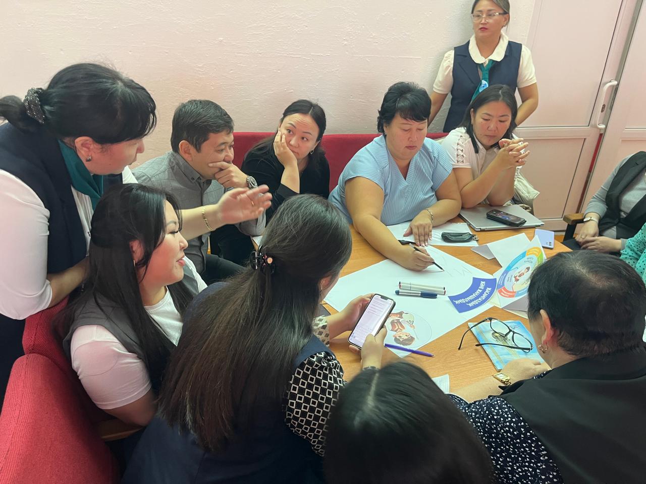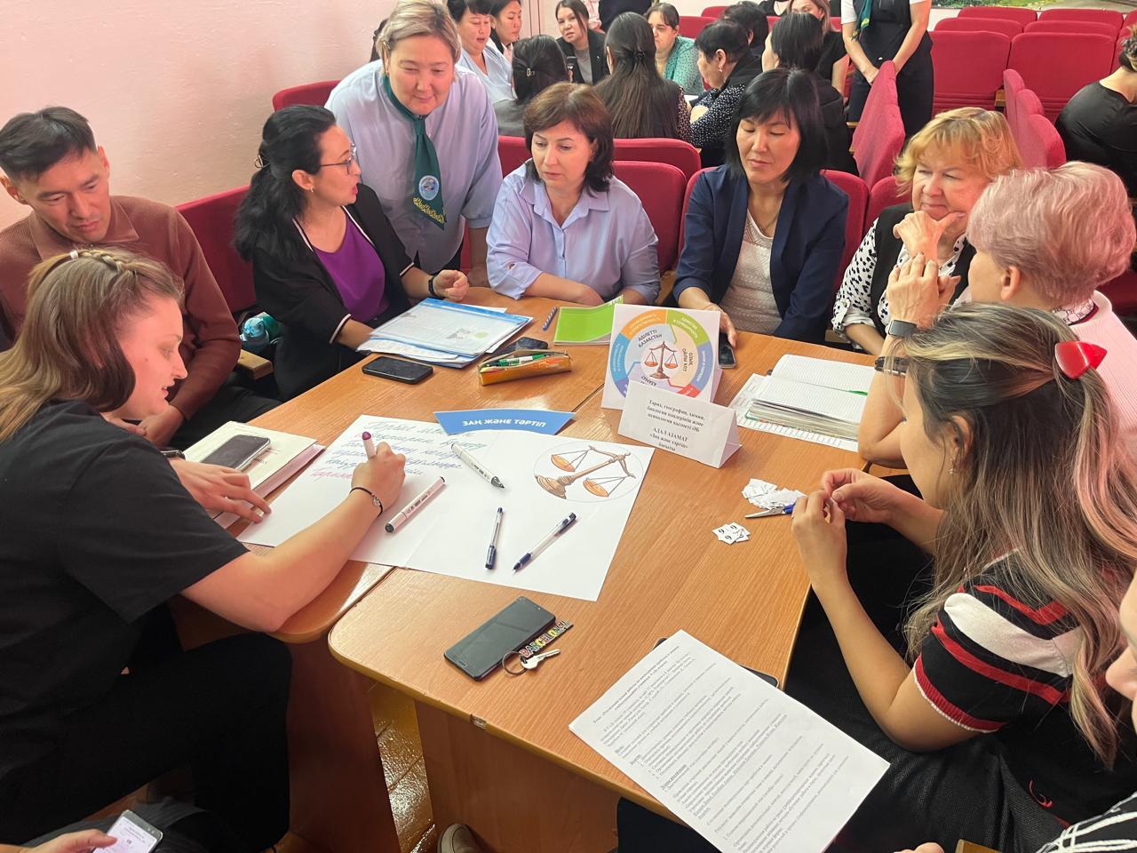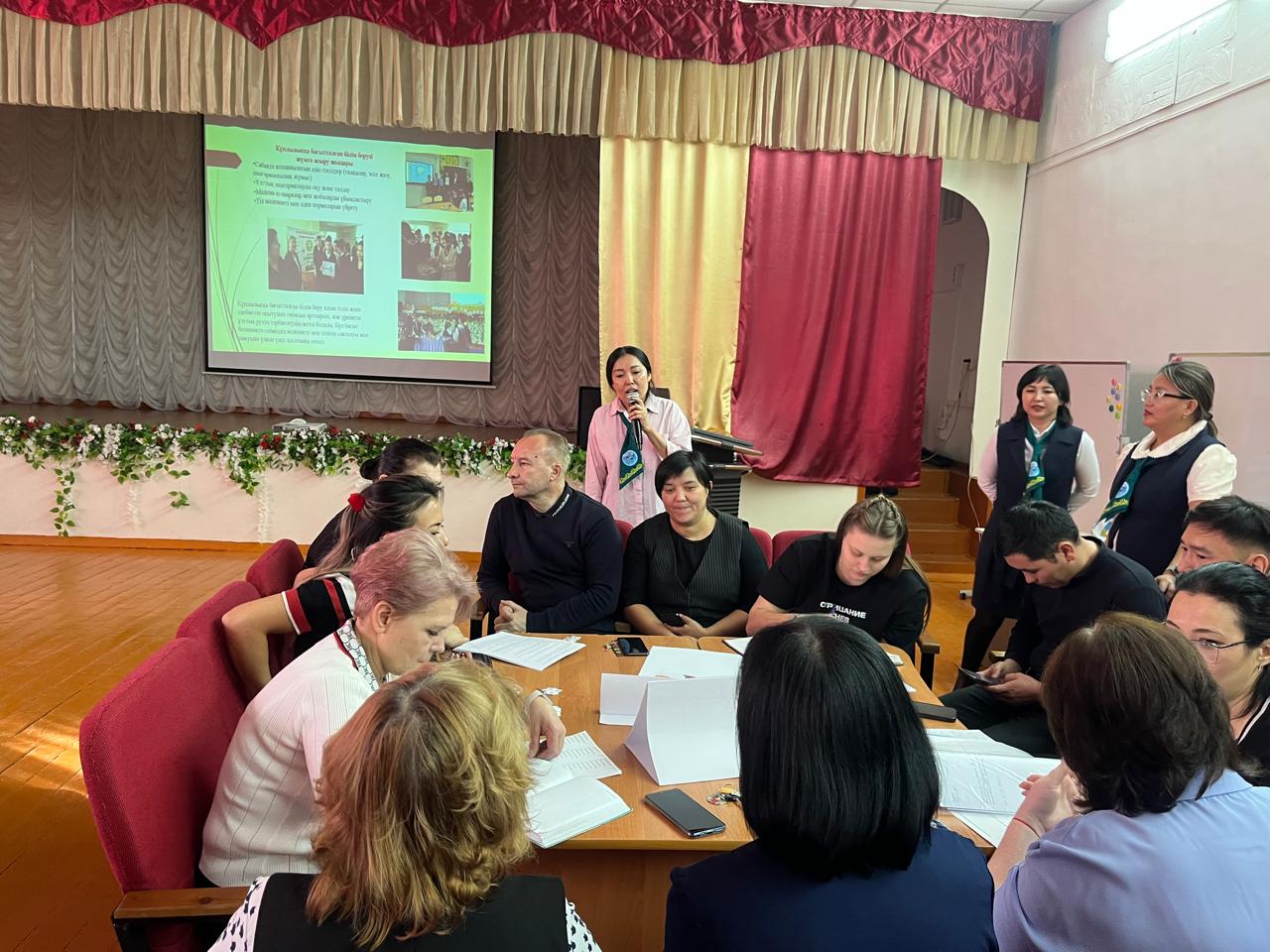Одан кейін Кенжебаева Г.М. ұжыммен топтық жұмыс жүргізіп, педагогтер өз сабақтарында оқу мақсаттарын «Адал азамат» құндылықтарымен қалай ұштастыратынын талдап, қорғап шықты.